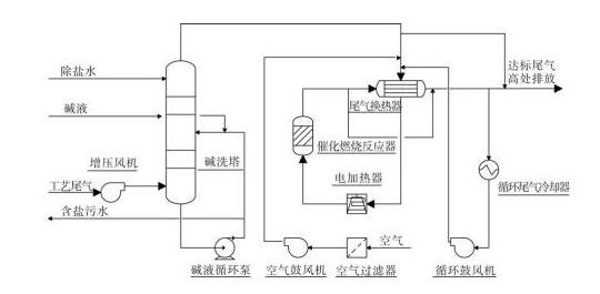 在本工藝中,設置循環尾氣冷卻器及循環鼓風機,將循環尾氣冷卻到40~50℃引入尾氣換熱器入口,以此來控制催化燃燒反應器出口溫度。由于工藝尾氣中不含有氧氣,因此進行催化燃燒反應所必須的氧氣由空氣鼓風機從大氣中引入裝置。本工藝開工階段利用電加熱器加熱尾氣的方式進行開工預熱,設備運行時需要的能量可由燃燒反應產生的熱量補給,電加熱器停用。