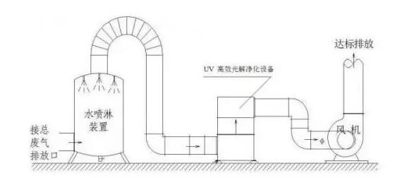 UV紫外法是利用特制的高能高臭氧UV紫外線光束照射廢氣,改變廢氣的分子結構,使有機或無機高分子廢氣化合物分子鏈在高能紫外線光束照射下,降解轉化成低分子化合物的方法。工藝流程圖如下: