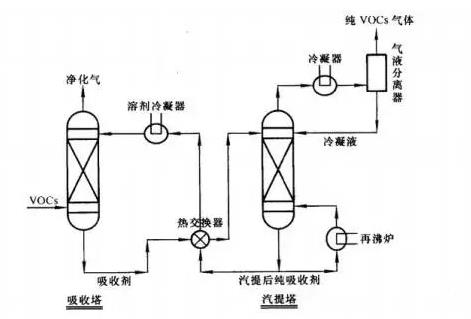 物理吸收是廢氣中一種或幾種組分溶解于選定的液體吸收劑中,這種吸收劑應具有與吸收組分有較高的親和力,低揮發性,同時還應具有較小的揮發性,吸收液飽和后經加熱解吸再冷卻重新使用。常見工藝流程圖如下: