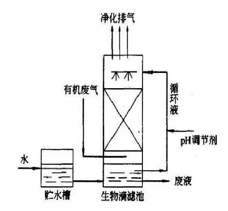 生物滴濾法是將廢氣經過去塵增濕或降溫等預處理工藝后,從濾床底部由下向上穿過由濾料組成的濾床,廢氣由氣相轉移至水—微生物混和相,通過固著于濾料上的微生物代謝作用而被分解掉的一種方法。