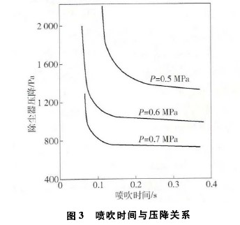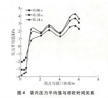 脈沖除塵器脈沖閥的噴吹時間越長,布袋除塵器的清灰效果也會越明顯。同時,脈沖閥噴入布袋內部的壓縮空氣的風量也會越多。但是除塵器的噴吹時間如果增加到一定值后由于除塵集風箱內風量等的原因,除塵器清灰效果的提升就會變得不再明顯。一般情況下,布袋式除塵器脈沖閥的噴吹時間設定在0.1~0.2s之間。噴吹時間對布袋內壓力平均值的影響如圖所示。