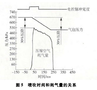 壓縮空氣消耗量主要限制的因素比較多,但主要包括噴吹壓力、噴吹周期、噴吹時間、結構類型及通經等因素。圖5為噴吹壓力條件下噴吹時間和脈沖閥耗氣量的關系。