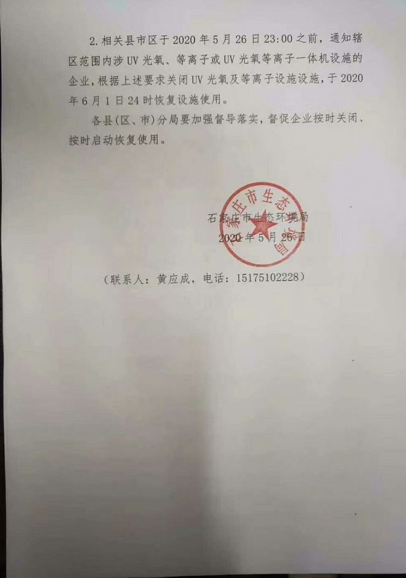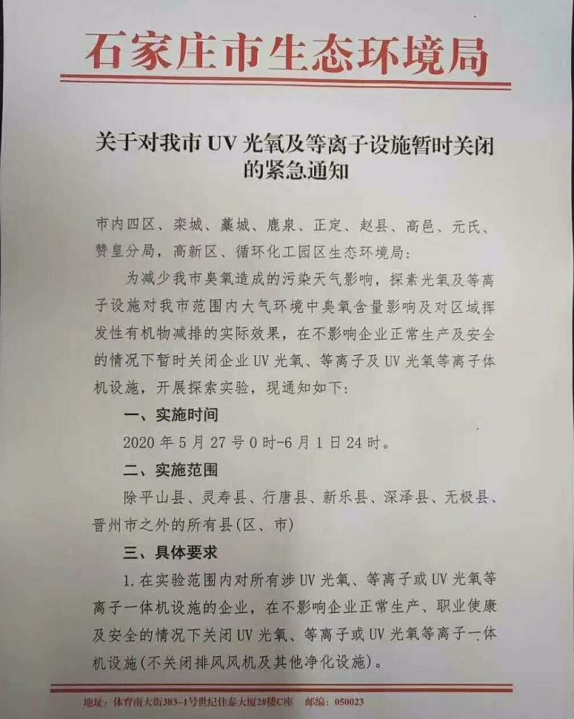 近日,一份河北石家莊市生態(tài)環(huán)境局的文件引起了廣泛流傳,主要內(nèi)容為:為探索光氧及等離子VOCs治理設施對石家莊大氣環(huán)境中臭氧含量影響就對應區(qū)域VOCs減排實際效果,在不影響企業(yè)正常生產(chǎn)及安全的情況下暫時關閉企業(yè)UV光氧、等離子及UV光氧等離子體機設施(但不關閉排風風機及其它凈化措施),開展探索實驗。實施時間為:5月27日0時到6月1日24時!