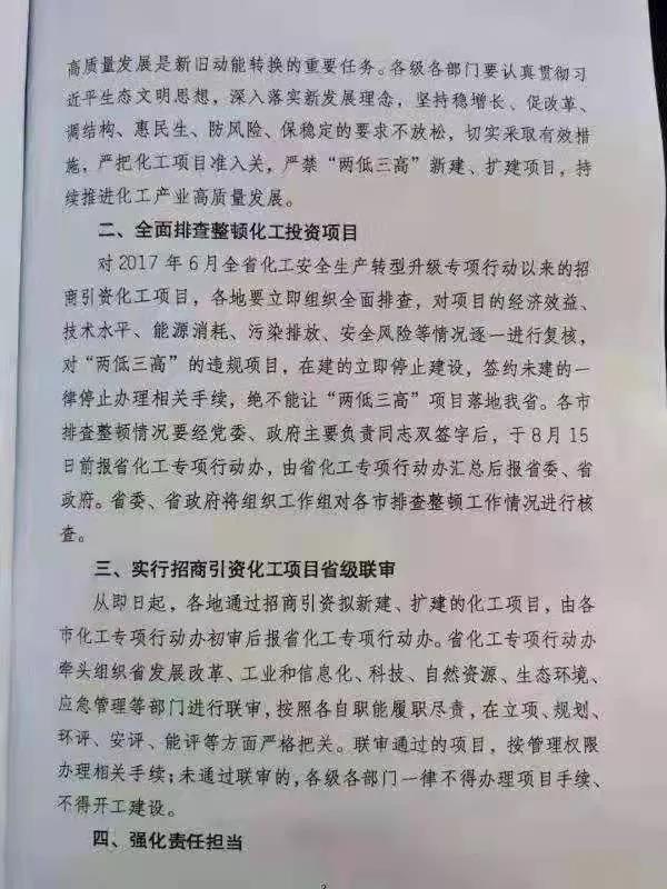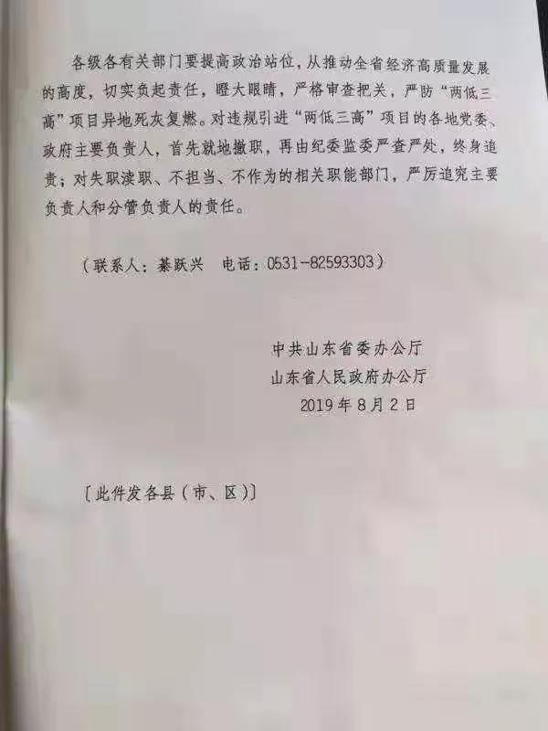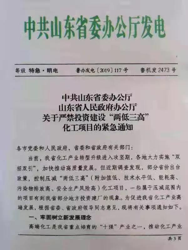 2019年8月2日,山東省政府發文,嚴禁引入“兩低三高”(附加值低、技術水平低、能耗高、污染物排放高、安全生產風險高)項目,將執行招商引資化工項目省級聯審流程,全面排查整頓省內的化工投資項目。