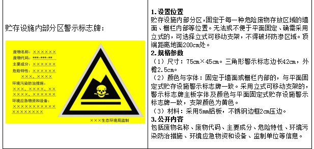 (4)本設施環境污染防治措施:根據設施內貯存危險廢物種類及危險特性,明確須采取的環境污染防治措施,在對應項目前打“√”。采用立式固定式貯存設施警示牌的,直接填寫相應環境污染防治措施。