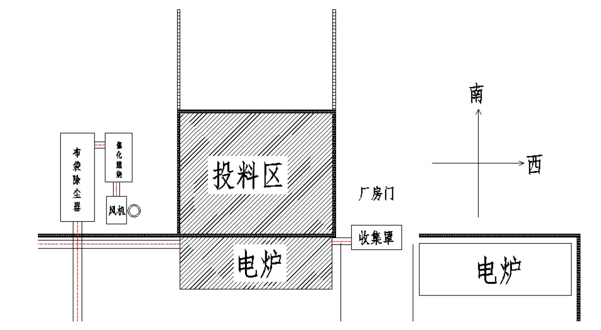 3、 對投料區和電爐進行管路改造,并在南門口增加集塵罩,用原有的環保設備進行處理,保證粉塵的有效處理。