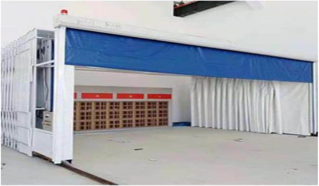 伸縮移動前室整體為鋼制框架結構,可前后伸縮移動。框架之間的滑動連續機構保證在框架驅動裝置的帶動下,沿地面軌道前后豎直平移,同時帶動篷布展開合攏。移動前室收縮合攏時,將工件移入工作區,展開時可進行工件的噴漆或打磨工作,在不噴漆的工作時間,可將前室合攏,騰出空間場地作為其他與噴漆交叉作業的工序使用。